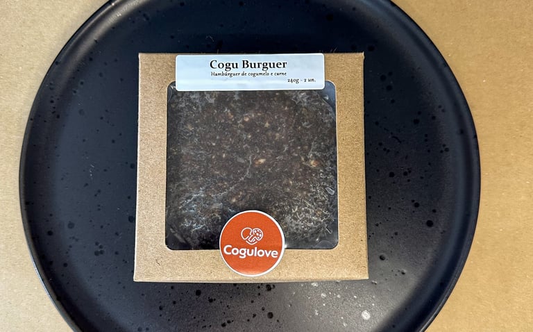 Hambúrguer elaborado com 70% cogumelo e 30% carne bovina.